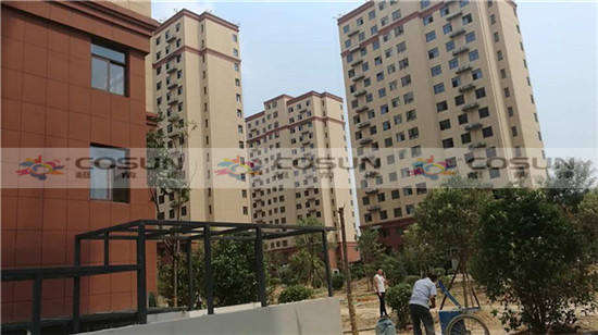 河南鄭州楊金路新科技市場旁邊北徐莊安置房工地面積7萬平方,為了追求高端住宅的需要,能從視覺上彰顯整個建筑的高雅與莊重之美,甲方在經過嚴格考察篩選后,超前涂料順利入圍。項目中指定超前真石漆做為外墻專用漆。